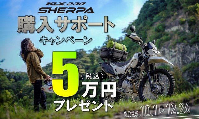 ■期間中に申し込みフォームよりキャンペーンに申し込みをし、KLX230 SHERPA(2025年モデル)の新車をご購入いただいたお客様に、購入時のお支払い金額の一部としてご利用いただける5万円分のクーポンをプレゼントします。詳しくはお問い合わせください。